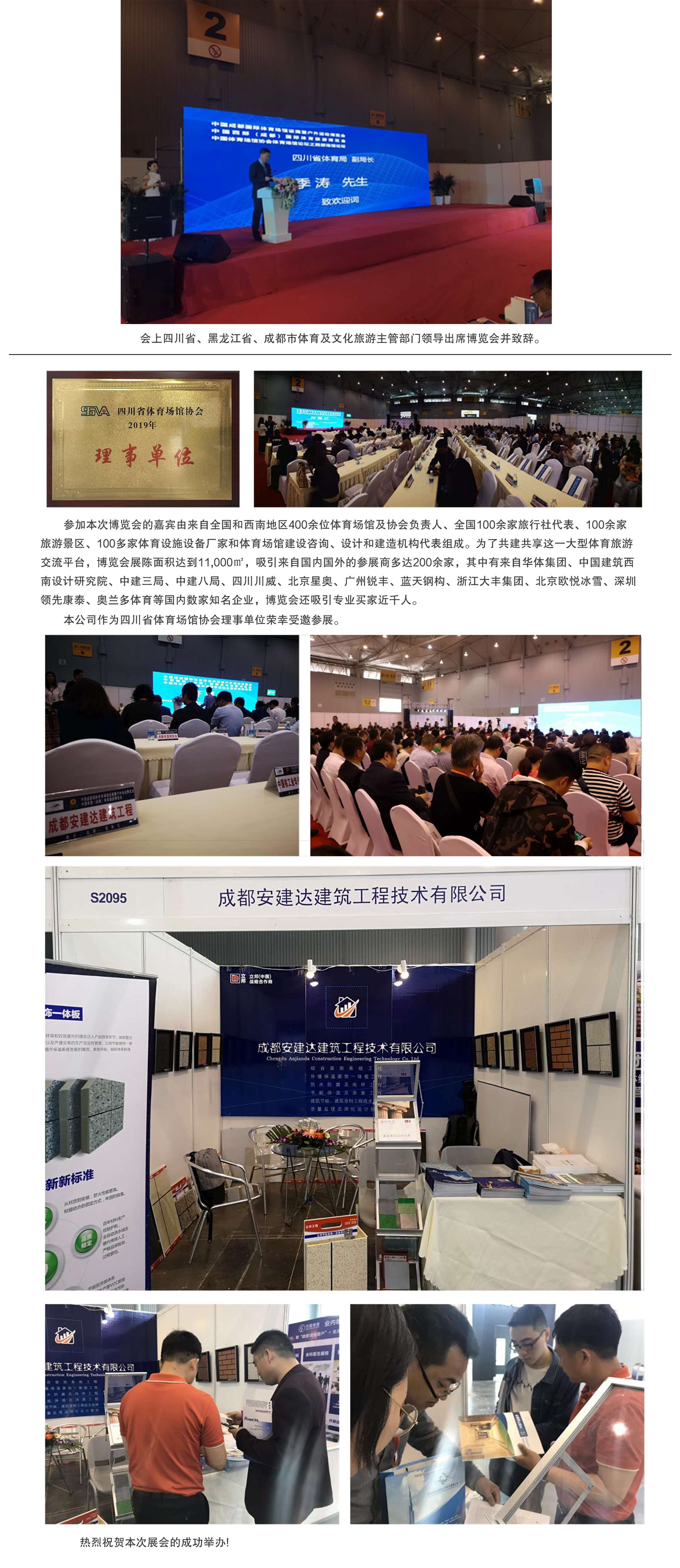 2019年4月19日,以“體旅聯(lián)動(dòng)、助推西部(成都)體旅國際化”為主題的、會(huì)期三天的2019中國成都國際體育場館設(shè)施暨戶外運(yùn)動(dòng)博覽會(huì)&中國西部(成都)國際體育旅游博覽會(huì)在成都市正式拉開序幕。